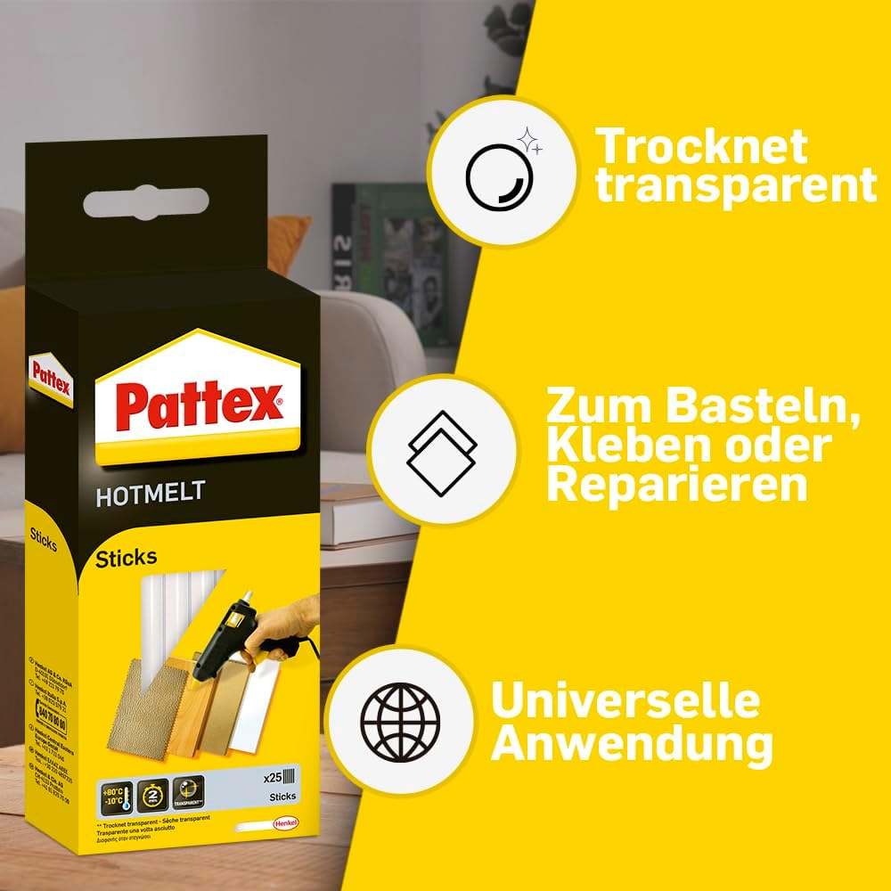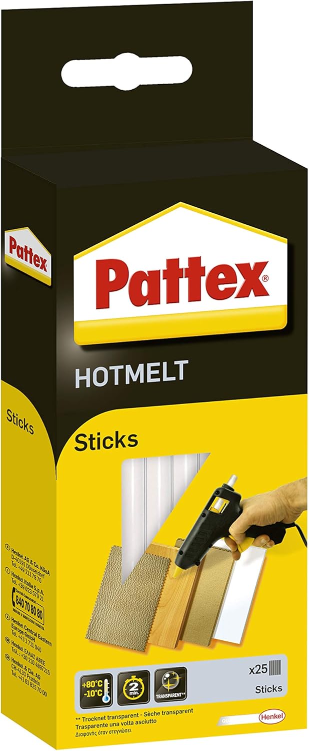 Pattex Hotmelt Sticks – Extrem transparente Klebestäbe für saubere, unsichtbare Verklebungen im Handwerk und Hobby. Die 25 Heißklebesticks mit 11mm Durchmesser eignen sich ideal für Bastler, Heimwerker und Handwerker, die Wert auf professionelle Ergebnisse legen. Mit 2 Minuten Trockenzeit und hoher Transparenz nach dem Aushärten liefern diese Klebesticks zuverlässige Verbindungen auf verschiedensten Materialien.