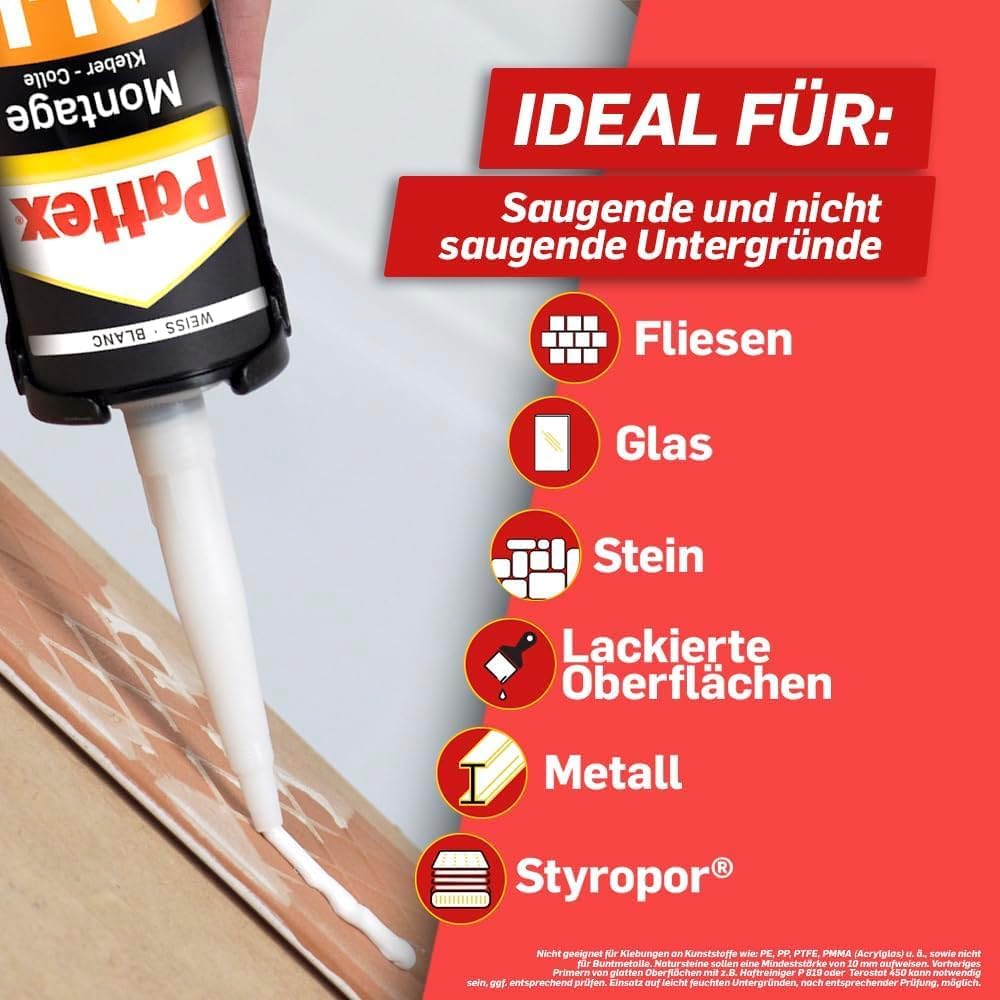 Der Pattex Montagekleber All Materials ist die All-in-One-Lösung für Handwerker, Monteure und ambitionierte Heimwerker, die eine sofortige Fixierung ohne mechanische Hilfsmittel benötigen. Dieser Hochleistungskleber ersetzt Schrauben oder Dübel bei einer Vielzahl an Reparatur- und Installationsarbeiten und sorgt für dauerhafte Stabilität sowohl im Innen- als auch im Außenbereich.