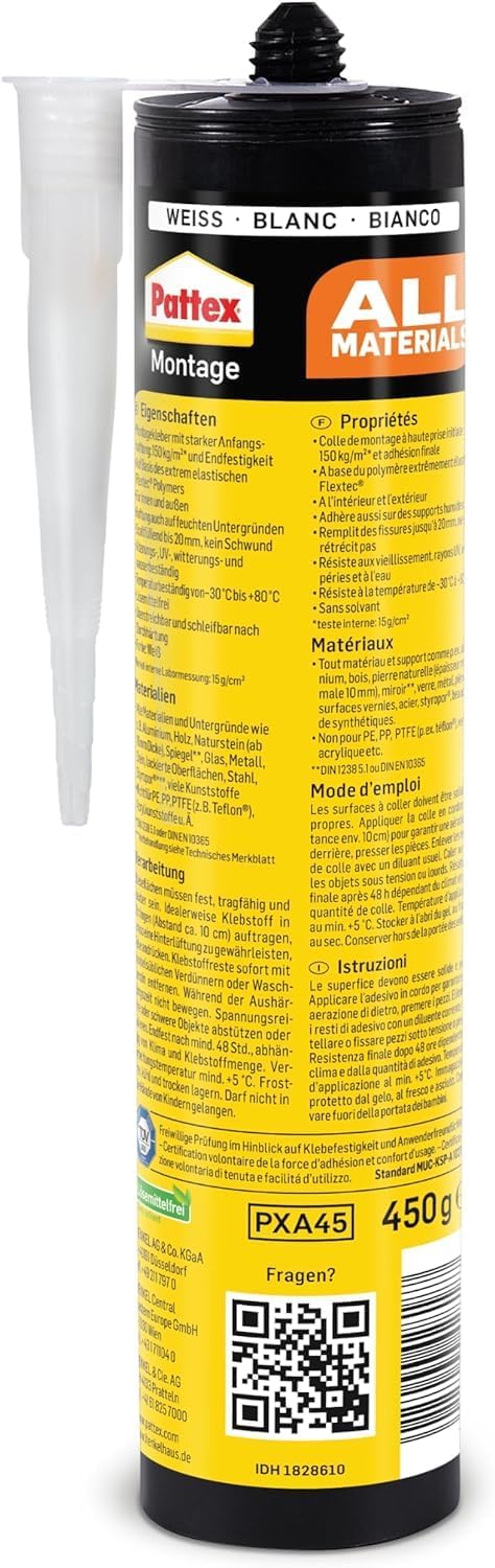 Der Pattex Montagekleber All Materials zeichnet sich durch eine starke Haftkraft aus und ist für den Einsatz in verschiedenen Umgebungen konzipiert. Mit einer Bewertung von 4,6 von 5 Sternen bietet er eine zuverlässige Lösung für viele Materialien. Bitte beachten Sie die produktspezifischen Anwendungshinweise zur Feuchtigkeitsbeständigkeit.