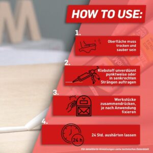 Ob auf der Baustelle oder in der Werkstatt: Wir empfehlen den Einsatz für alle Anbauteile, bei denen eine Durchdringung des Untergrunds (Bohren) vermieden werden soll. Besonders bei der Montage von dekorativen Elementen oder bei schnellen Reparaturen an Installationen ist dieser Kleber die erste Wahl. Achte darauf, dass die zu verklebenden Oberflächen staub- und fettfrei sind, um die volle Haftkraft zu erzielen.