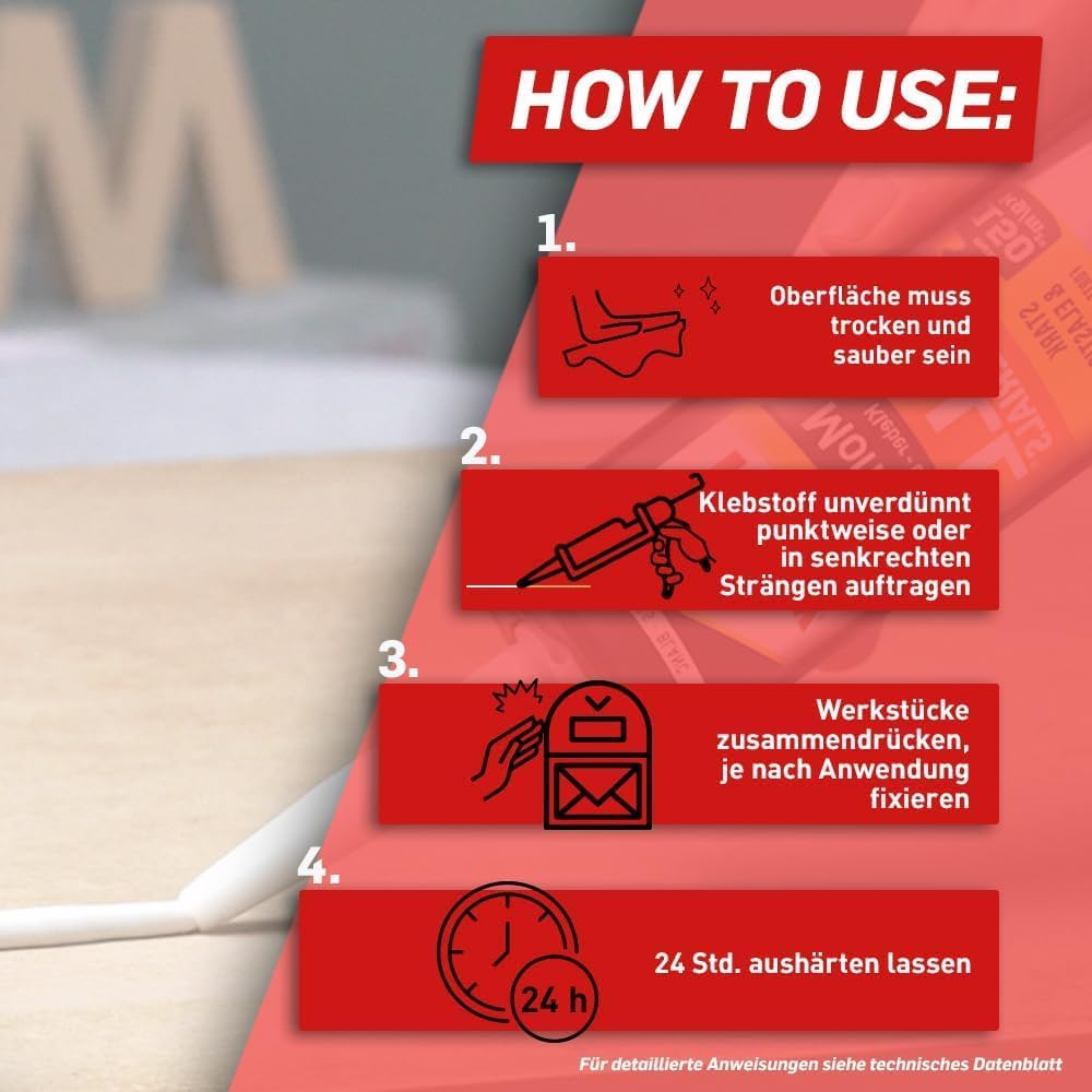 - Universelle Materialhaftung: Verbindet saugende und nichtsaugende Materialien wie Metalle, Kunststoffe, Stein und Holz ohne zusätzliche Grundierung.