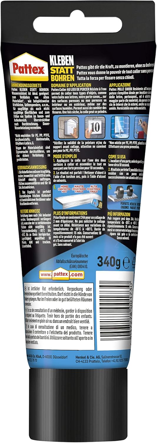 In der Werkstatt oder bei Montageeinsätzen vor Ort ersetzt er Schrauben und Dübel bei Anwendungen, bei denen die Wandbeschaffenheit kein Bohren zulässt oder das Bohren langfristige Schäden verursachen würde. Wir empfehlen eine sorgfältige Reinigung der Klebeflächen von Staub und Fett, um die maximale Klebkraft des Pattex Montagekleber Kleben statt Bohren auf Materialien wie Metall, Kunststoff oder Keramik voll auszuschöpfen.