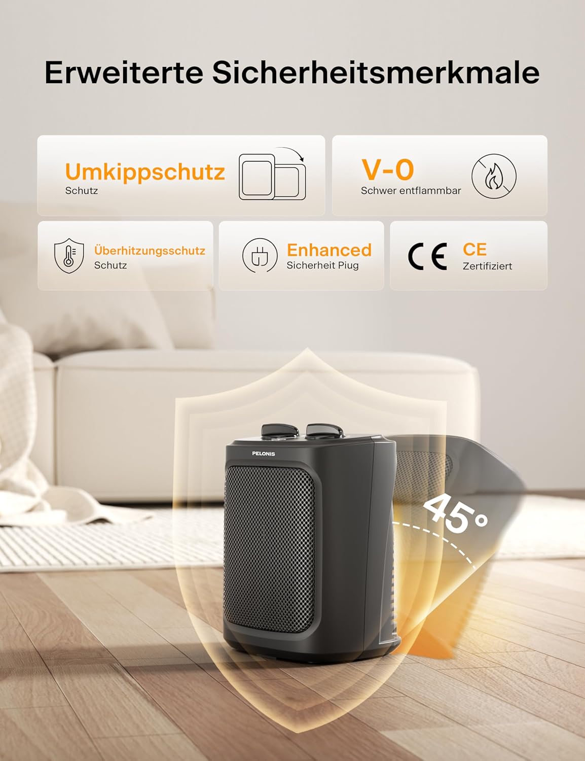 Der Pelonis Heizlüfter ist auf eine sichere Anwendung im Innenbereich ausgelegt. Er bietet eine zuverlässige Leistung, die von Kunden mit 4.4★ bewertet wurde. Achten Sie bei der Nutzung stets auf einen stabilen Stand des Gerätes.