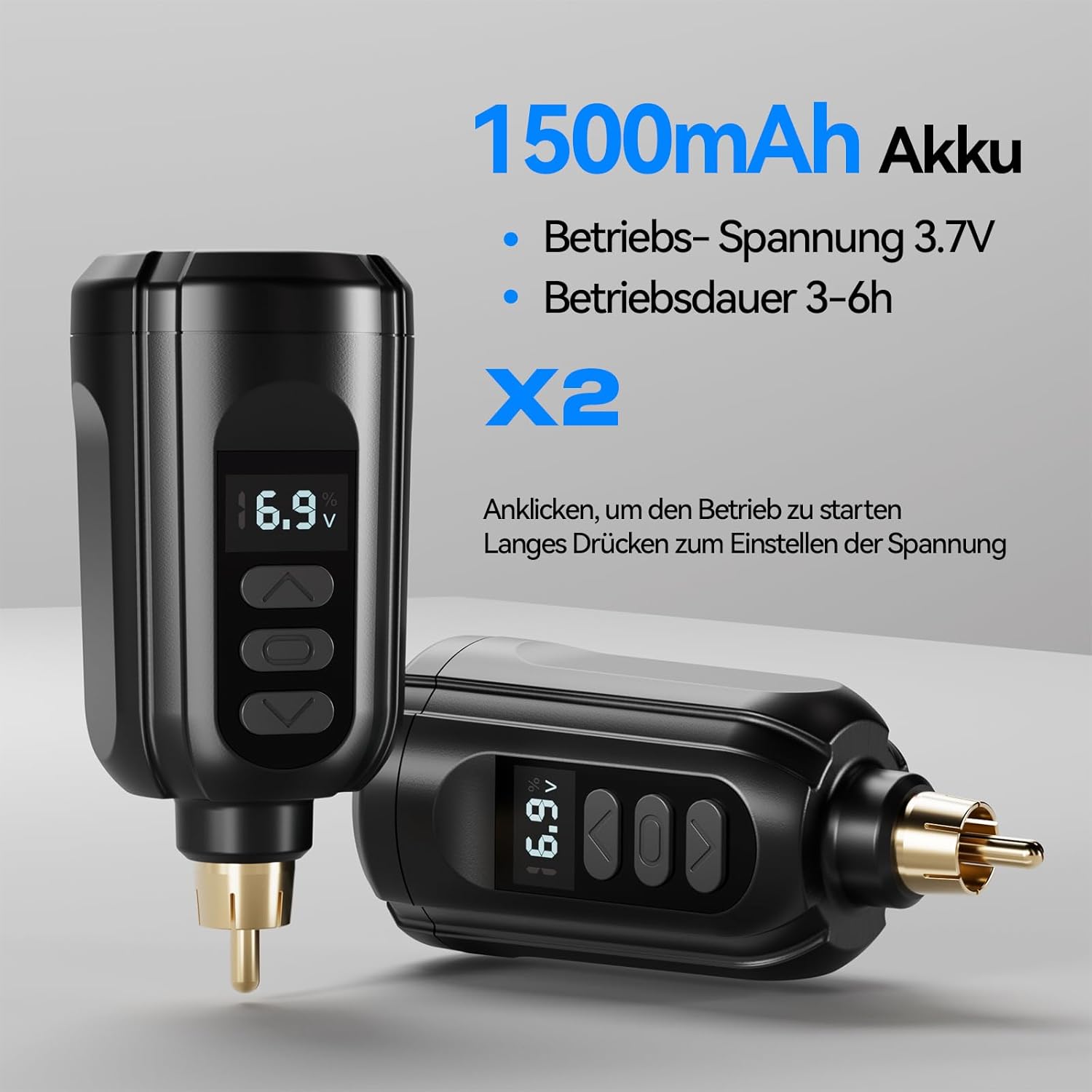 Die PFARRER Maschine ist mit zwei 1500 mAh Li-Ionen-Akkus ausgestattet, die eine kontinuierliche Betriebsdauer von insgesamt 4 bis 6 Stunden ermöglichen. Dies sorgt für unterbrechungsfreies Arbeiten, ohne dass ein häufiges Aufladen während des Tätowierens erforderlich ist.