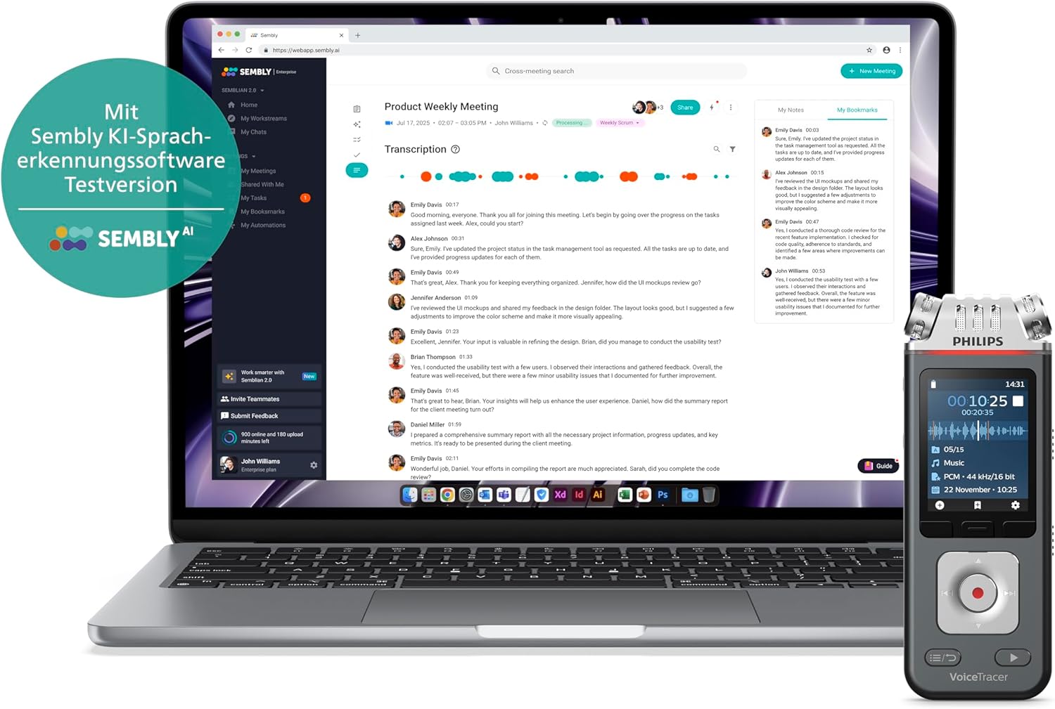• Sembly AI-Testlizenz (30 Tage): Mehrsprecher-Spracherkennung, Transkription und KI-generierte, präzise Besprechungszusammenfassungen. Unterstützt 50 Sprachen