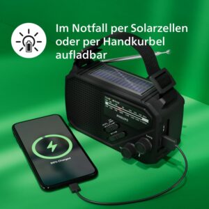 Mit dem Philips TAR1609 Kofferradio mit Taschenlampe sind Sie für alle Situationen gewappnet. Dieses handliche Gerät bietet zuverlässige analoge AM-/FM-Einstellung, eine integrierte Li-Ionen-Batterie und mehrere Auflademöglichkeiten. Dieses Radio ist Ihr perfekter Begleiter beim Wandern, Camping oder auch im Notfall. Die ausziehbare Antenne sorgt für guten Empfang und die starke Taschenlampe beleuchtet Ihren Weg. Und mit einem SOS-Alarm mit Alarmton und Blitzlicht können Sie im Notfall auf sich aufmerksam machen. Dieses praktische Kofferradio verfügt über eine Handkurbel und eine Solarzelle für den Reservestrom, damit Ihnen nie der Strom ausgeht. Bei Bedarf können Sie den USB-A-Anschluss auch zum Aufladen Ihres Handys und anderer Geräte verwenden. Mit bis zu 32 Stunden Radiospielzeit mit einer einzigen Ladung können Sie den ganzen Tag über Radio und Nachrichten anhören. Für die Handlichkeit gebaut: Mit dem einstellbaren Trageriemen kann Sie das Philips TAR1609 überall begleiten. Das Radio ist leicht, robust und für alle Abenteuer bereit. Dieser zuverlässiger Begleiter sollte auf keiner Reise fehlen. Taschenlampe, Ton und Notstrom kombiniert in einem intelligenten Gerät.““