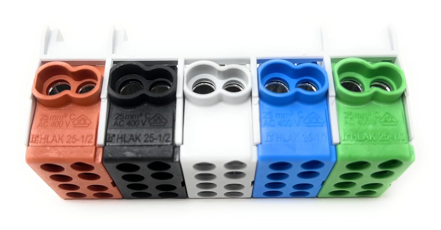 - • Farblich kodiert: Fünf unterschiedliche Farben (braun, schwarz, grau, blau, grün) ermöglichen eine sofortige Zuordnung der Phasen, Neutral- und Schutzleiter.
