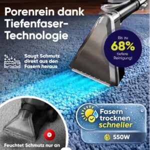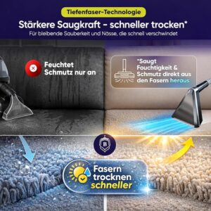 - Effektive Tiefenreinigung: Die Tiefen-Faser-Technologie dringt tief in das Gewebe ein und löst hartnäckigen Schmutz, den herkömmliche Staubsauger nur oberflächlich behandeln würden.