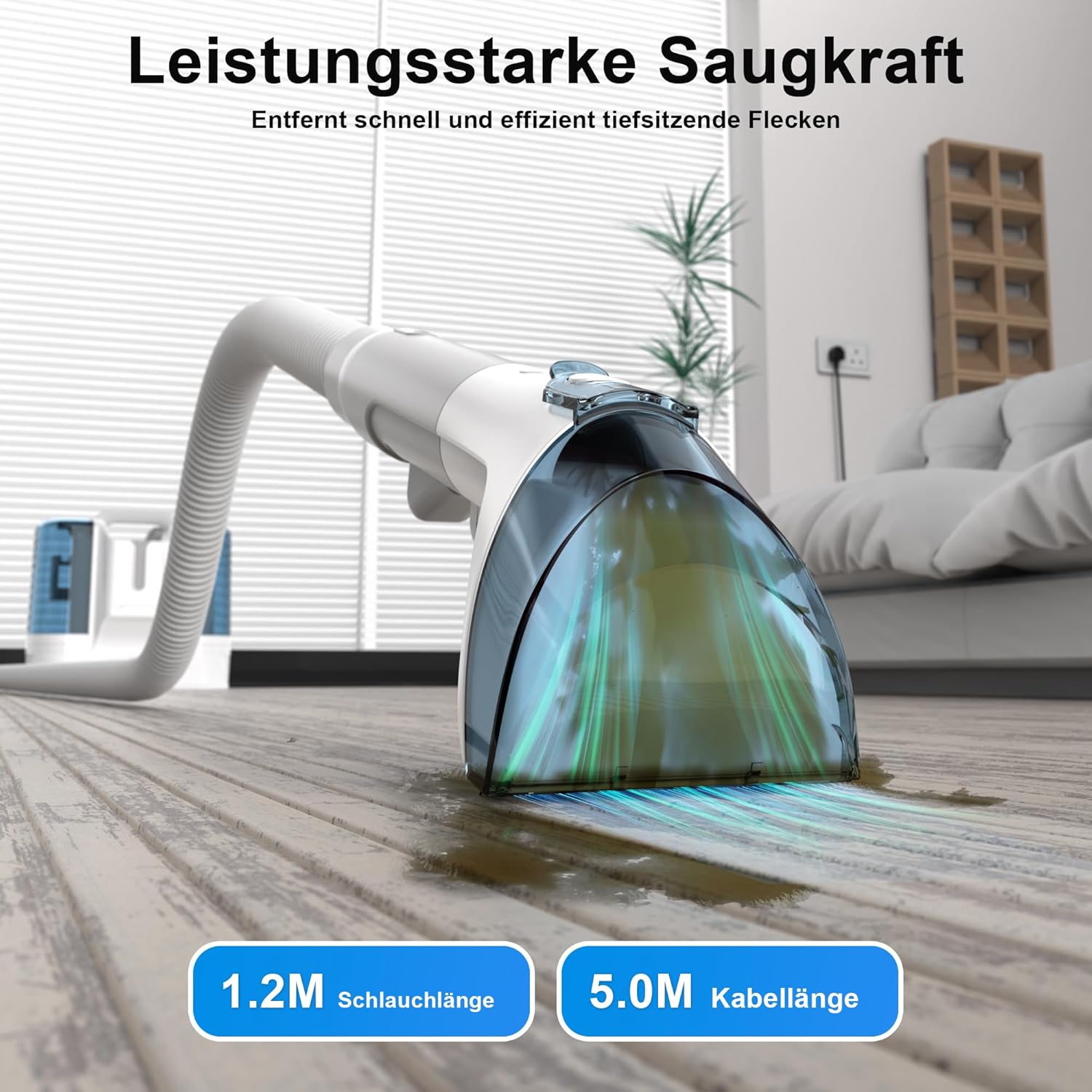 - Vielseitige Einsatzmöglichkeiten: Das Polsterreiniger Gerät Nasssauger eignet sich für diverse Textilien, von Autositzen über Sofas bis hin zu langflorigen Teppichen.