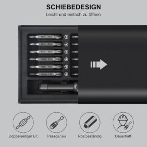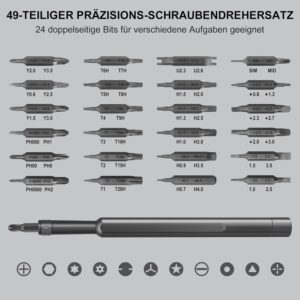 Das SHARDEN Mini-Schraubendreher-Set zeichnet sich durch seine 24 doppelendigen Schraubendreher-Bits aus, die insgesamt 48 verschiedene Antriebsvarianten abdecken. Zusammen mit dem passenden Griff bietet das Set eine vollständige Lösung für anspruchsvolle Reparaturaufgaben an elektronischen Geräten.