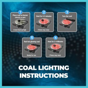 Um diese Kohlen effizient durchzuglühen, empfiehlt sich ein elektrischer Kohleanzünder oder ein Gaskocher. Legen Sie die Würfel auf das Gitter und wenden Sie diese nach etwa der Hälfte der Zeit, bis sie rundum gleichmäßig rot glühen. Achten Sie auf eine ausreichende Belüftung während des Anzündvorgangs.