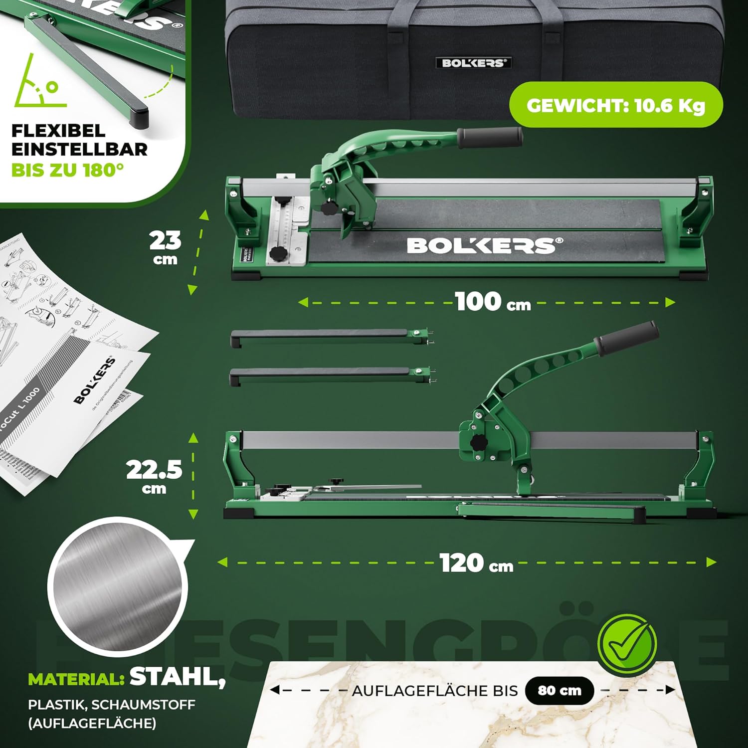 Der BOLKERS ProCut L 1000 Fliesenschneider ist das ideale Werkzeug für ambitionierte Heimwerker und Fliesenleger, die bei Renovierungs- und Ausbauprojekten Wert auf millimetergenaue Ergebnisse legen. Mit einer Schnittlänge von 1000 mm ermöglicht diese Maschine das saubere Trennen großer Formate und sorgt durch ihre stabile Konstruktion für effiziente Arbeitsabläufe bei jedem Projekt.
