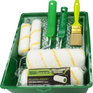 Ein hochwertiges Malerset umfasst idealerweise eine Auswahl an verschiedenen Rollengrößen für unterschiedliche Flächen. Das vorliegende Set enthält zwei 18 cm Polyacryl-Farbrollen für große, flache Wände sowie zwei 11 cm Rollen, die perfekt für schwer zugängliche Stellen geeignet sind.