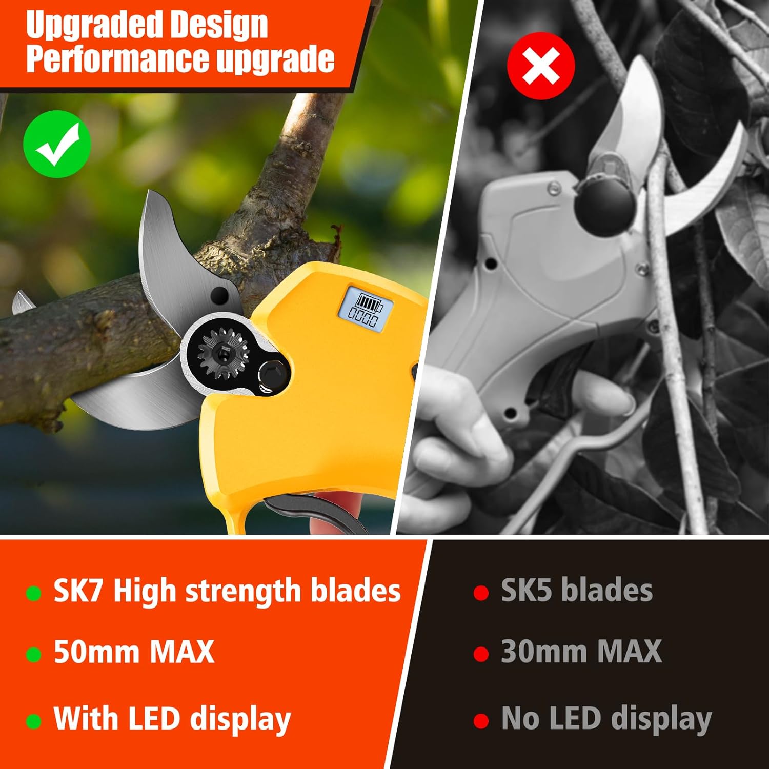 - 【Hochleistungs Astschere Akku mit Bürstenlosem Motor】 Unsere Astschere Akku verfügt über einen leistungsstarken bürstenlosen Motor, der viel Leistung liefert und mühelos 40 mm lange frische Äste schneidet. Der bürstenlose Motor erhöht die Lebensdauer der Gartenschere um 500 %, bei höherer Leistung und geringerem Energieverbrauch. Der einzelne 2000-mAh-Akku ermöglicht problemlos 1500 Schnitte.