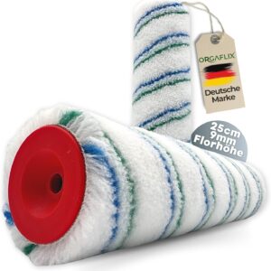Die optimale Florhöhe hängt vom Untergrund ab. Mit einer Florhöhe von 9 mm sind unsere ORGAFLIX Profi Farbwalzen ideal für glatte bis leicht strukturierte Oberflächen geeignet und sorgen für ein gleichmäßiges, professionelles Streichergebnis.