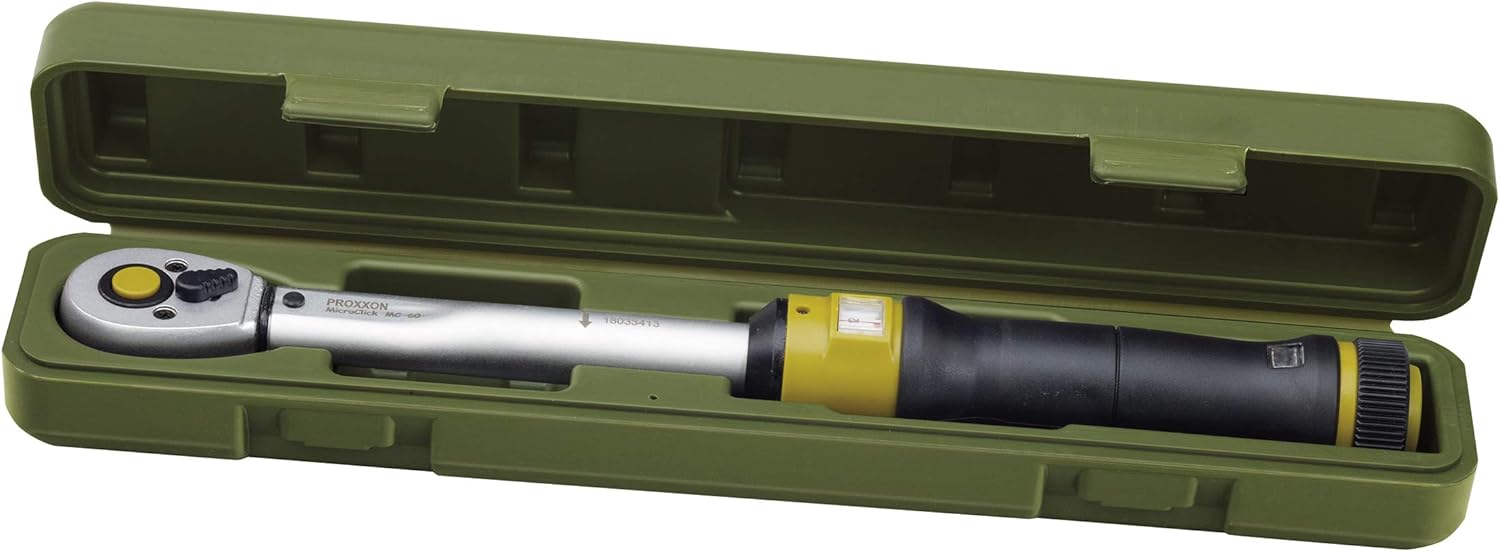 Proxxon MicroClick-Drehmomentschlüssel MC 60- praktischer Entriegelungsmechanismus: der Aufsatz sitzt fest und löst sich auf Knopfdruck von selbst- Umschalthebel für Rechts- und Linkslauf- stabiler, ovaler Schaft aus Stahl, mit optimalem Rostschutz: 2 x vernickelt, mattverchromt- Stück für Stück kalibriert und endgeprüft- deutlich lesbare Analoganzeige für das vorgewählte Drehmoment- ergonomischer Griff, den man durch seine Formgebung automatisch mittig greift- zusätzliche Mikro-Skala zum Feinju