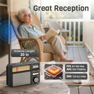 - 【Ausgezeichneter Empfang】FM: 87–108 MHz, AM: 510–1730 kHz und SW: 7.8–16.2 MHz — dieses weltempfänger Radio ermöglicht Ihnen den Zugang zu einer großen Auswahl an Sendern. Ausgestattet mit einem hochwertigen Chip und einer extra langen 50 cm Kupferantenne sorgt unser tragbares Radio für klarere und stärkere Signale — sodass Sie Ihre Lieblingssender ganz einfach empfangen können, von Nachrichten und Wetter bis hin zu Musik und Sport — und das ohne Störgeräusche.