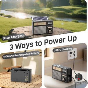 - 【3 Stromversorgungsoptionen】Lassen Sie sich den Spaß nicht durch eine leere Batterie verderben. Unser akku Radio bietet 3 praktische Möglichkeiten: einen eingebauten 1800mAh wiederaufladbaren Akku, USB-C-Ladung oder umweltfreundliche Solarenergie. Ideal für drinnen und draußen — zu Hause, beim Camping oder bei unerwarteten Stromausfällen hält dieses tragbare Radio Sie verbunden.