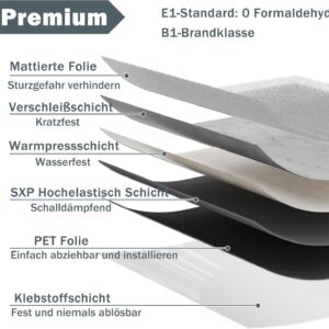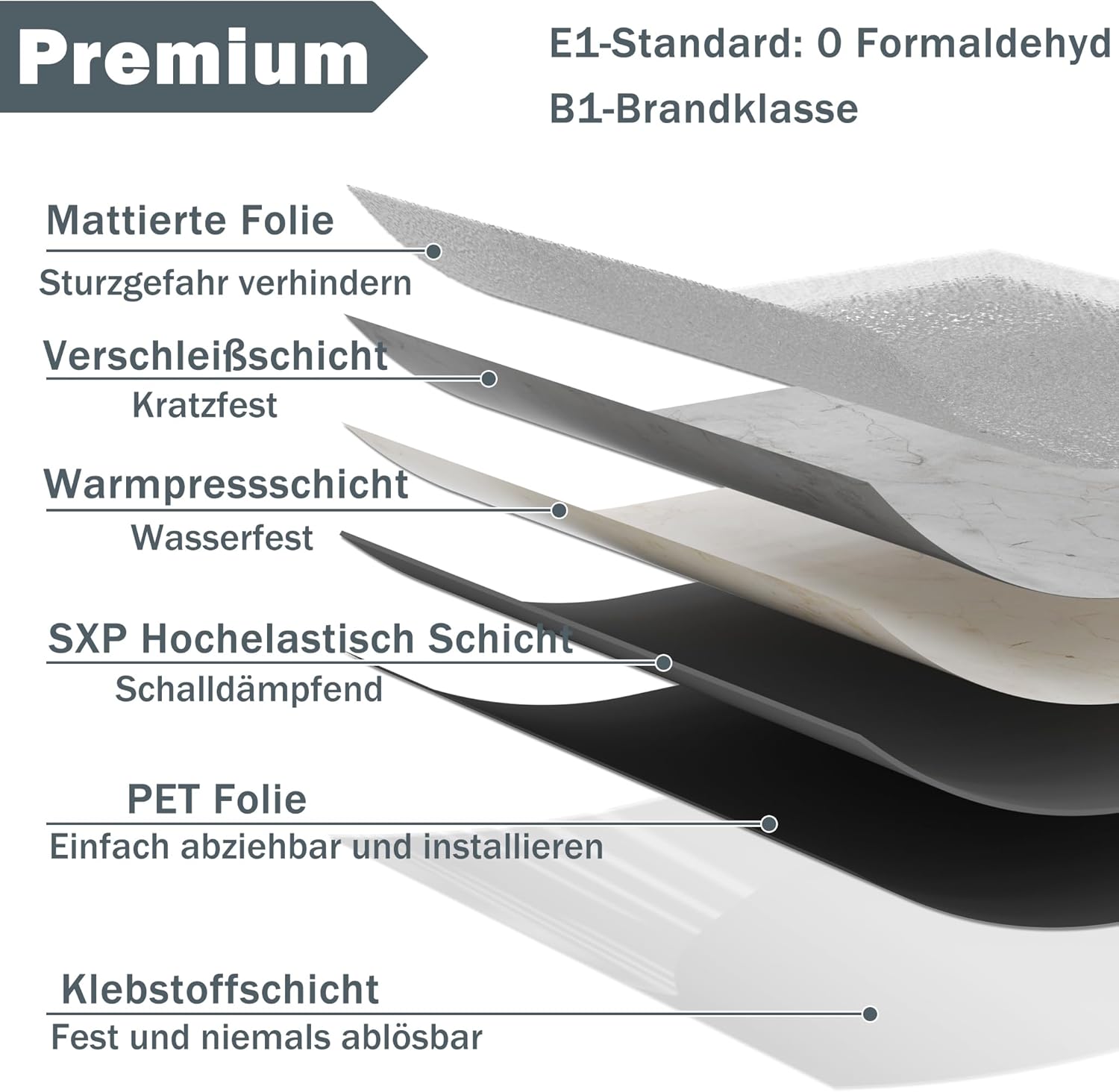 - Zeitsparende Verlegung: Dank der Kleberückseite entfällt der Kauf von zusätzlichem Bodenkleber oder Spezialwerkzeug; abziehen und aufkleben genügt.