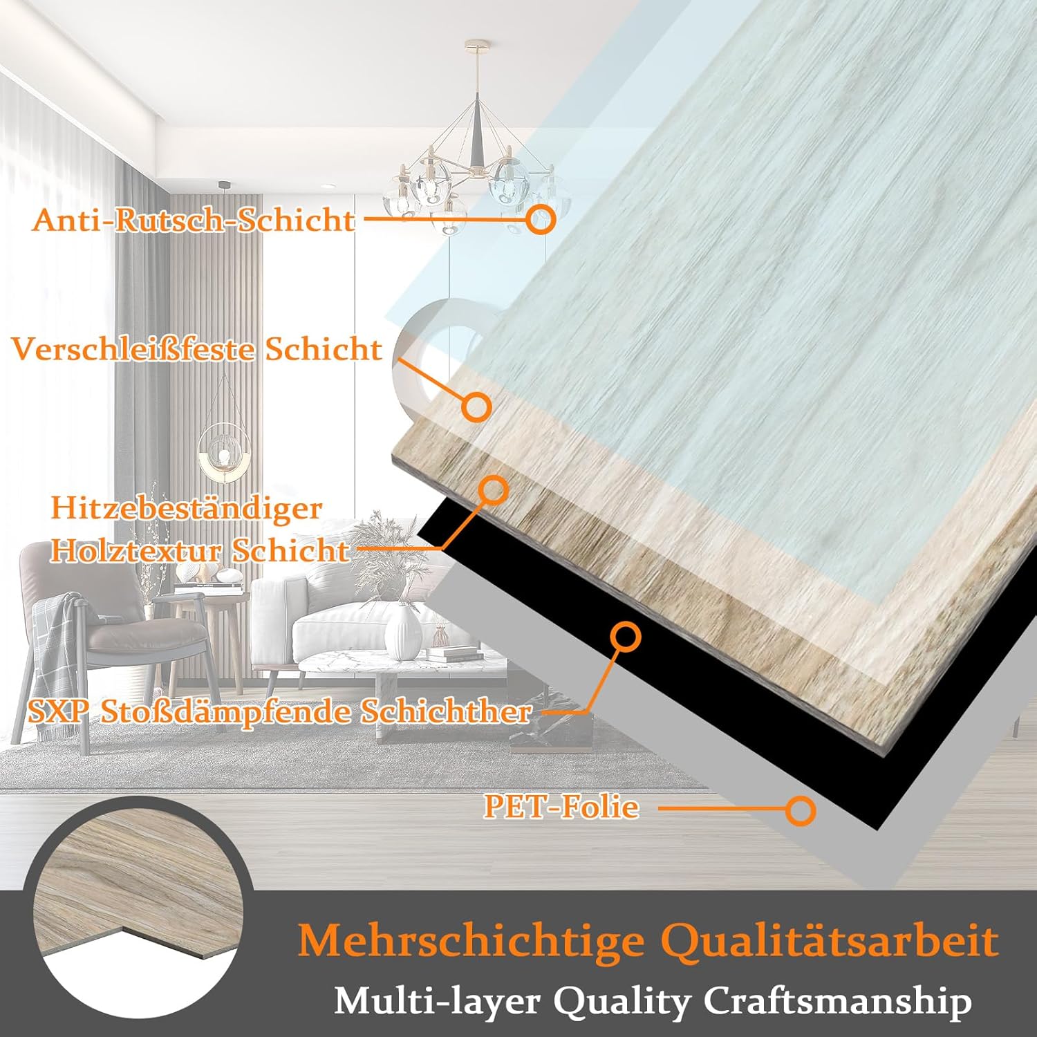 Ein großer Vorteil ist das natürliche Holzmusterdesign, das in Verbindung mit der leicht strukturierten Oberfläche ein angenehmes Gefühl beim Barfußlaufen vermittelt. Zudem besteht der Boden aus umweltfreundlichen Materialien, die keine schädlichen Gase freisetzen und somit für ein gesundes Wohnklima sorgen.