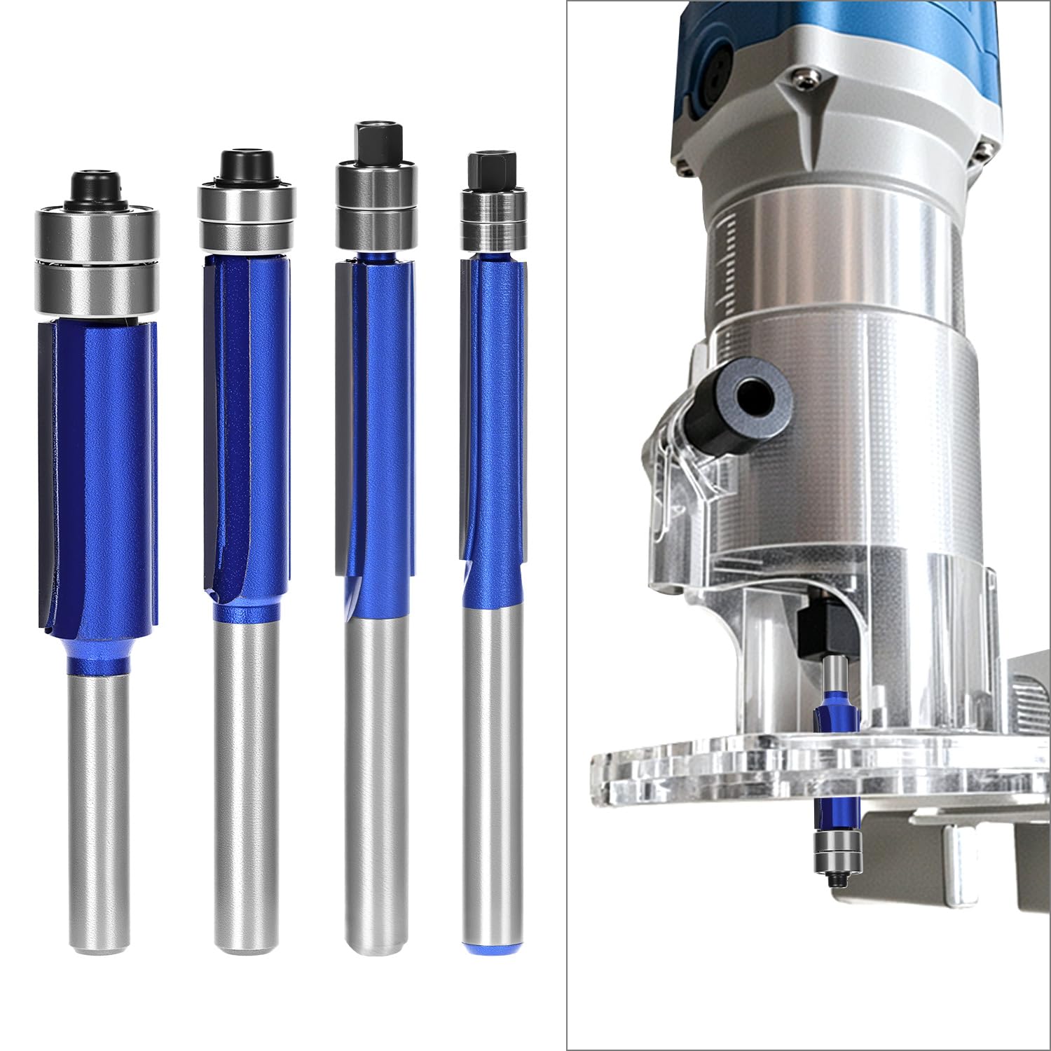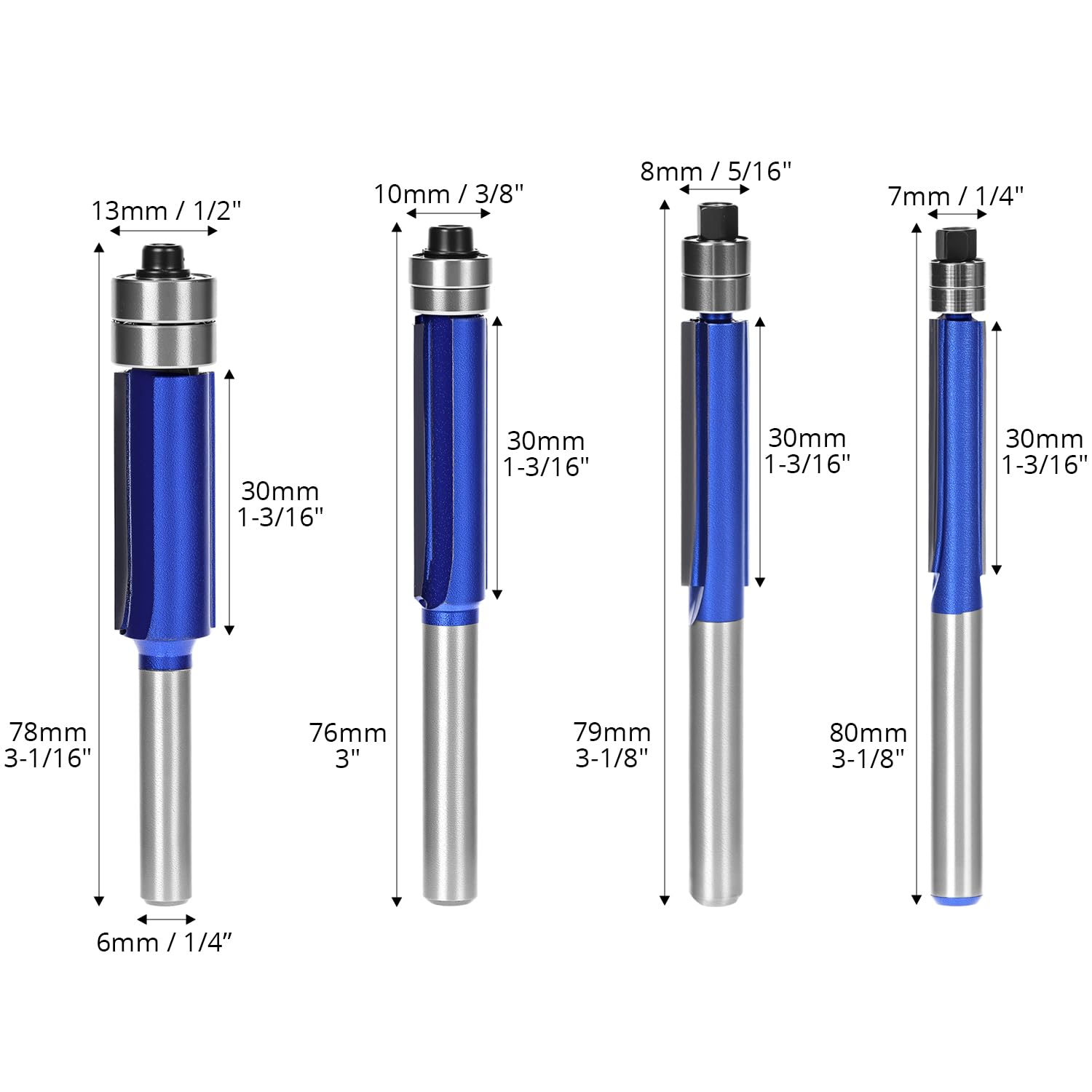 Die in diesem Set enthaltenen Bündigfräser verfügen über einen standardisierten 6-mm-Schaft. Bitte stellen Sie sicher, dass Ihre Oberfräse für diesen Schaftdurchmesser ausgelegt ist.