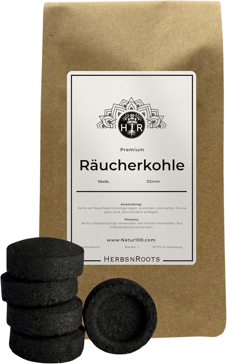 Räucherkohle selbstzündend 33 mm • 10 Stück Kohletabletten • Ideal zum Räuchern von Weihrauch, Harzen & Räuchermischungen • Schnellzündende Räucherwerk Kohle • HerbsnRoots –