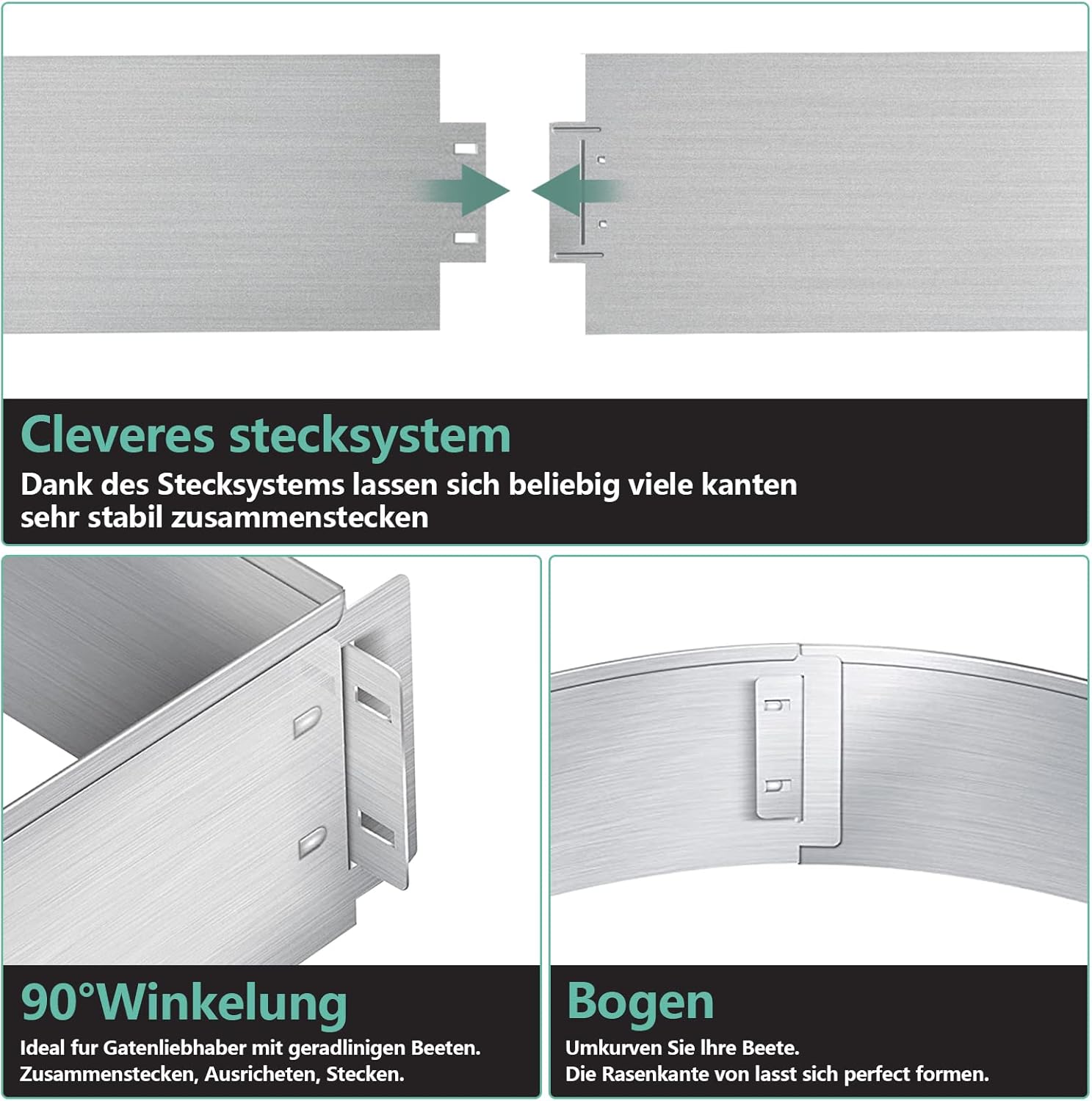 Das ist eigentlich selbsterklärend, wenn man einmal den Dreh raus hat: Die einzelnen Elemente werden einfach per Stecksystem miteinander verbunden, ganz ohne Schrauben oder schweres Gerät. In der Praxis zeigt sich, dass man die Kanten durch die Metall-Plastizität super leicht in Form biegen kann, egal ob man gerade Linien oder geschwungene Beete bevorzugt. Einfach den Boden leicht vorstechen und die Kante bündig einlassen – hält von alleine bombenfest im Erdreich.