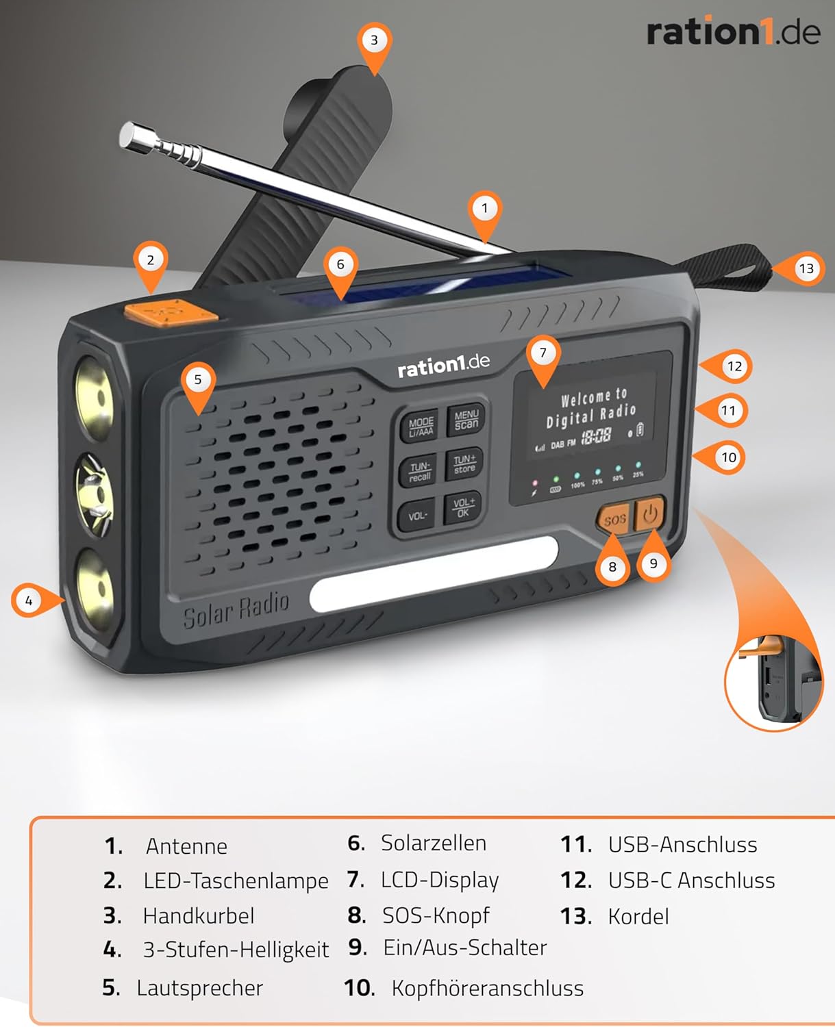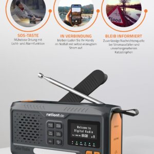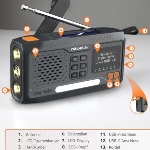 ration1 Kurbelradio DAB+, Tragbares Solarradio mit LED-Taschenlampe, 2000mAh Powerbank, Handkurbel, SOS-Funktion, Bluetooth, USB-C, für Camping und Notfall – ration1.de
