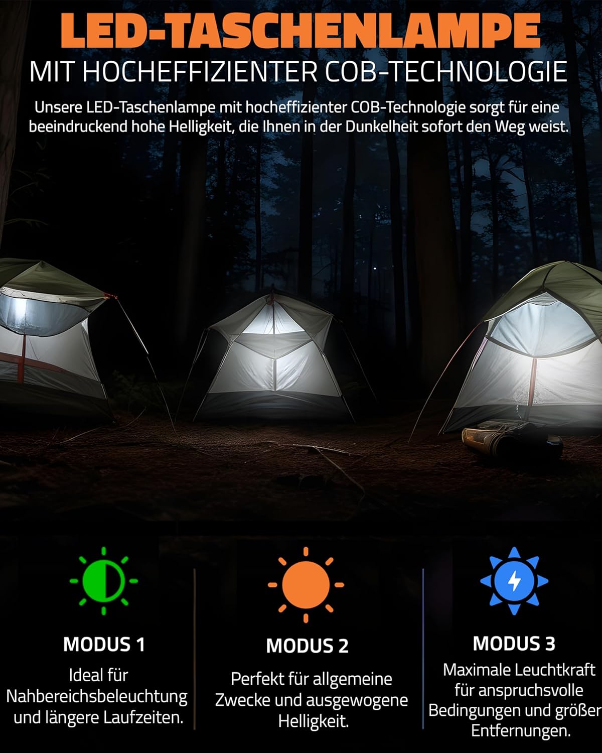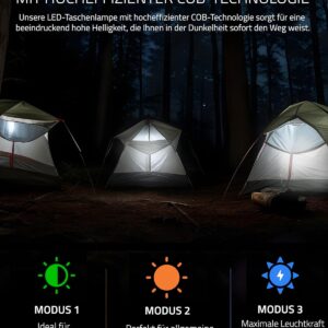 - NOTFALLFUNKTIONEN: Helle LED-Taschenlampe mit COB-Technologie, separate Leselampe, SOS-Notsignal mit Alarm und Lichtfunktion. Gute Sicht in dunkler Umgebung, perfekt für die Outdoor Ausrüstung oder bei Stromausfall