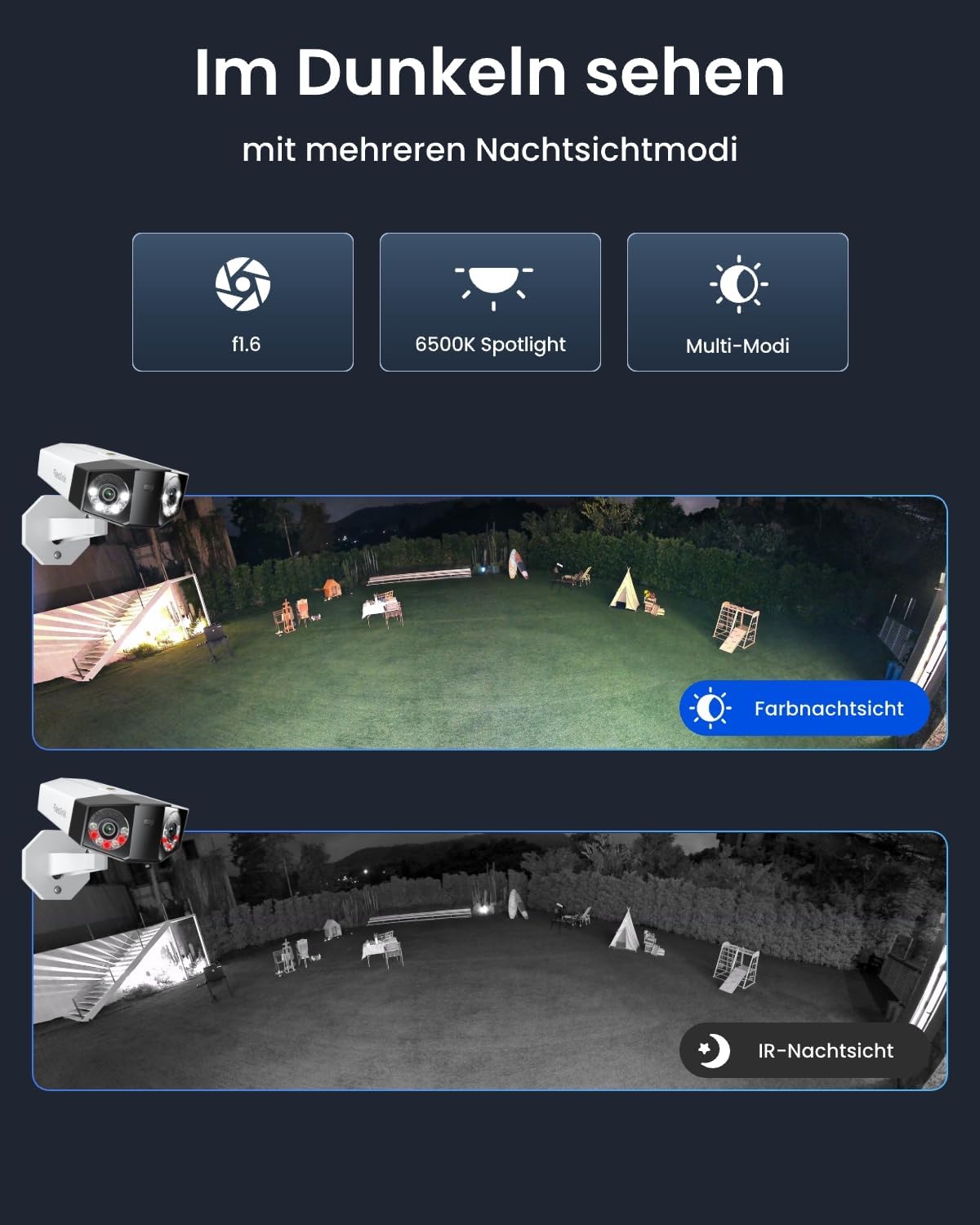 - 16MP UHD & FARBNACHTSICHT: Diese Dual-Objektiv Kamera verfügt über zwei 4K-Bildsensoren, um alle Details zu erfassen. Die F1.6 Superblende und der 1/2,7'' CMOS-Sensor ermöglichen eine bessere Lichtaufnahme, während 6 Infrarot-LED-Lichter alle nächtlichen Details bis zu 100 Fuß enthüllen.