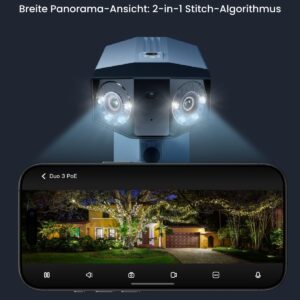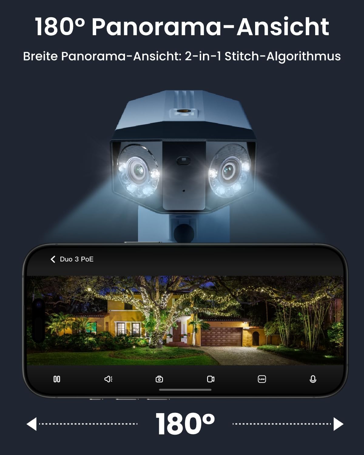 Reolink 16MP UHD Dual-Objektiv PoE Überwachungskamera außen mit 180° Panoramaansicht, Bewegungsspur, Farb-Nachtsicht, Personen-/Fahrzeug-/Tiererkennung, 2-Wege-Audio, 24/7 Aufzeichnung, Duo 3 PoE –