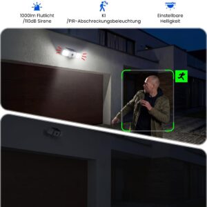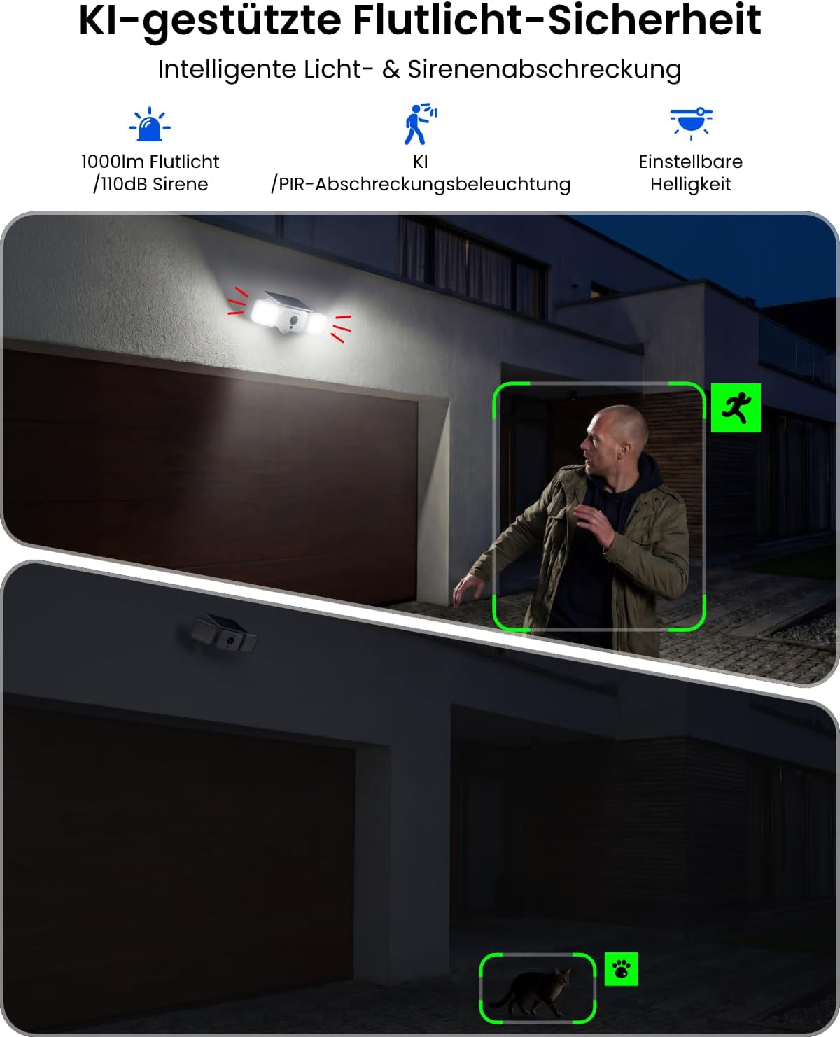 - Flutlicht-Sicherheit mit intelligenter KI: Mit einer einstellbaren Beleuchtung von bis zu 1000 Lumen, optionalen Sirenenalarmen und Farbnachtsicht bietet diese Aussenkamera Wlan Kabellos Akku eine leistungsstarke sichtbare Abschreckung. Die integrierte KI erkennt Personen, Fahrzeuge und Tiere präzise und löst nur bei echten Bedrohungen anpassbare Reaktionen aus – wodurch Fehlalarme reduziert werden.