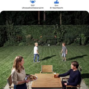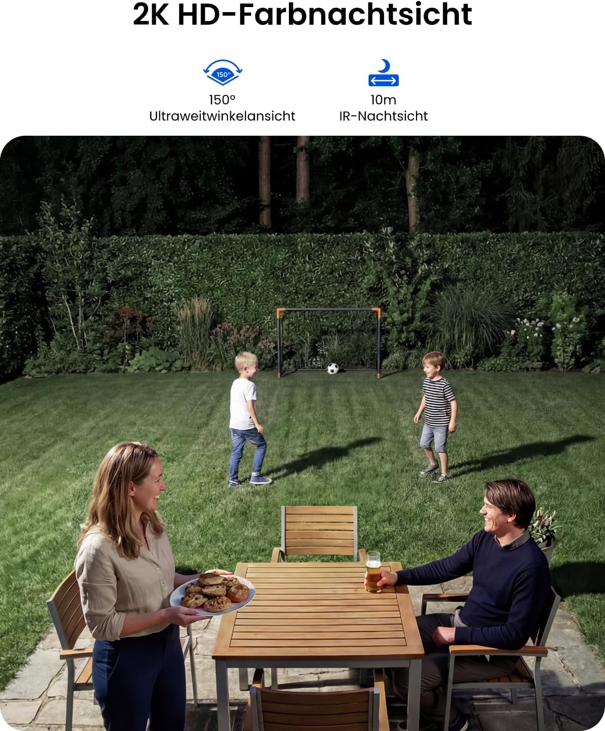 - Atemberaubende 2K-Farbnachtsicht: Erfassen Sie Tag und Nacht alle Details in Farbe mit einer Auflösung von 2K 4 MP, einem 150º-Ultraweitwinkel-Sichtfeld und einer 10m IR-Nachtsichtreichweite. Die Farbnachtsicht verbessert die Klarheit in der Dunkelheit, während das Ultraweitwinkelobjektiv tote Winkel minimiert und so rund um die Uhr zuverlässige Sicherheit bietet.