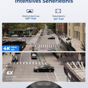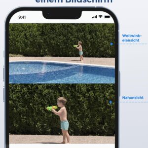 - Dual-Ansicht auf einem Screen: Sehen Sie genau, was in Ihrem Zuhause passiert – mit Dual-Ansicht auf einem Bildschirm. Das 8-mm-Teleobjektiv fängt Details in Nahaufnahme ein, während das 2,8-mm-Weitwinkelobjektiv einen Panoramablick ermöglicht.