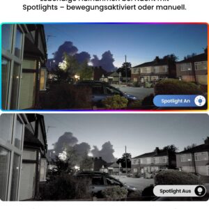- Spotlight-Nachtsicht: Sobald etwas passiert, gehen die Scheinwerfer an – das liefert nicht nur Farbbilder bei Nacht, sondern wirkt auch abschreckend auf Unbefugte.