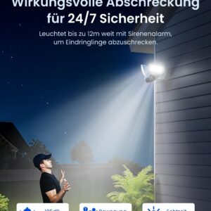 - 3000 Lumen Flutlicht: Die einstellbare Helligkeit schreckt Eindringlinge präventiv ab und sorgt bei nächtlichen Arbeiten für eine sichere Ausleuchtung des Arbeitsbereichs.