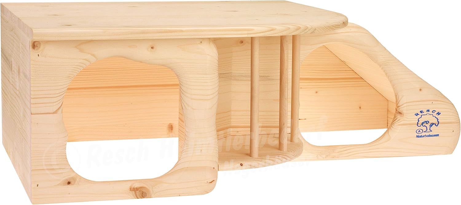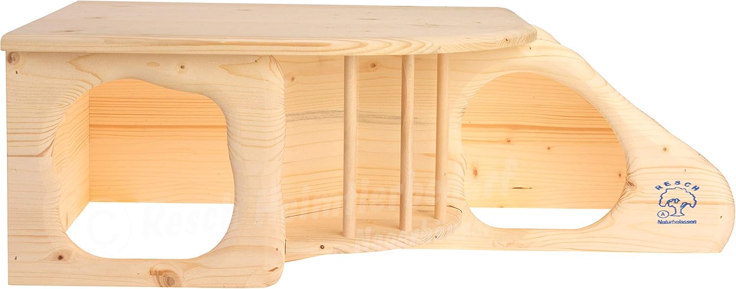 Die Resch Nr11 Nagerhöhle XL natur ist die ideale Lösung für anspruchsvolle Halter von Kaninchen, Meerschweinchen, Ratten und Degus, die ihren Tieren einen naturnahen Rückzugsort bieten wollen. Diese handgefertigte Konstruktion kombiniert Schlafplatz, Aussichtsterrasse und Futterstation in einem platzsparenden, robusten Modul aus massivem Fichtenholz.