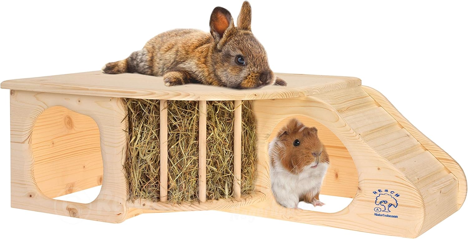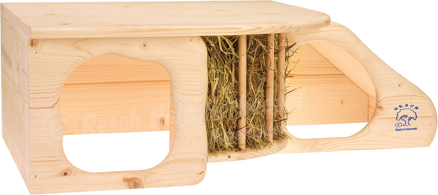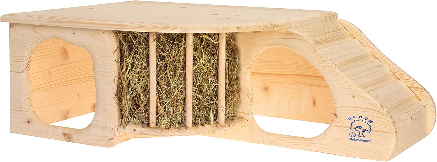 - Multifunktionales Design: Die Kombination aus geschützter Höhle, breiter Liegeterrasse und integrierter Heuraufe spart wertvollen Platz im Gehege.