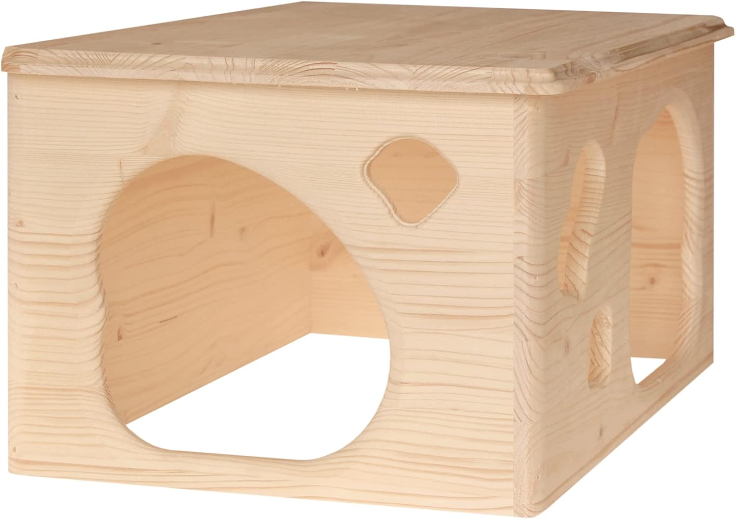 Die Höhle besteht aus hochwertigem, naturbelassenem Massivholz. Dieses Material ist robust und bietet den Kaninchen einen natürlichen sowie sicheren Unterschlupf innerhalb ihres Geheges.