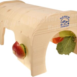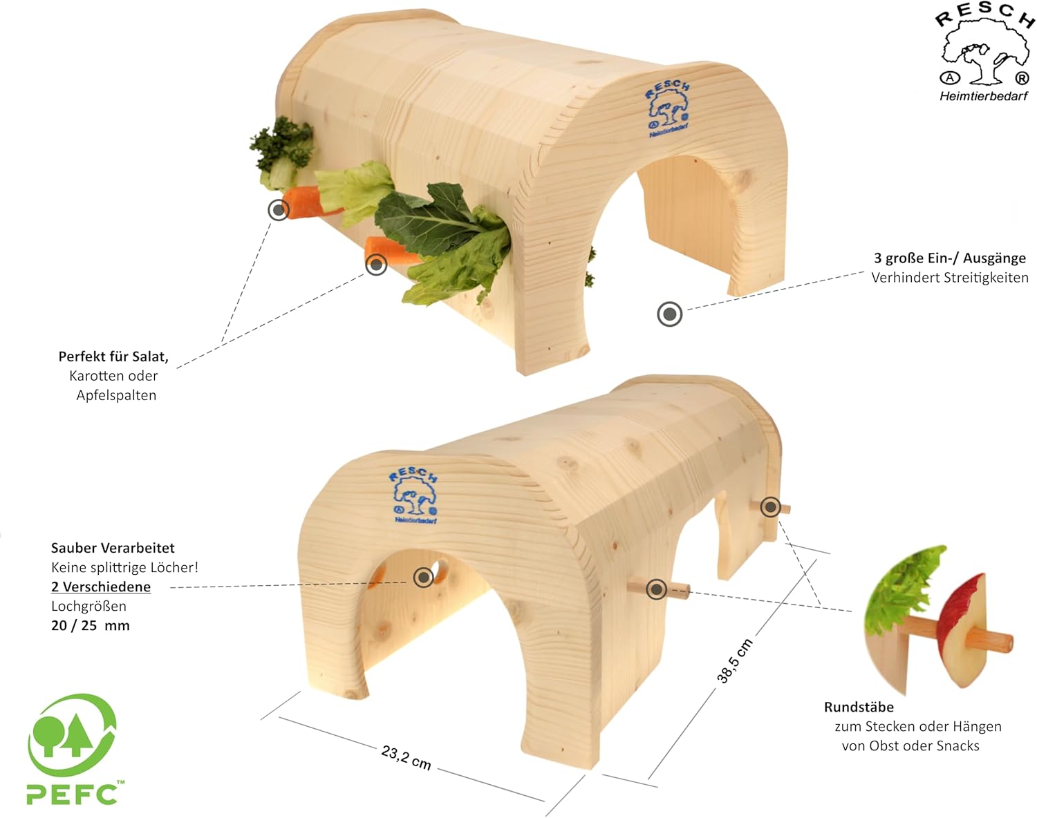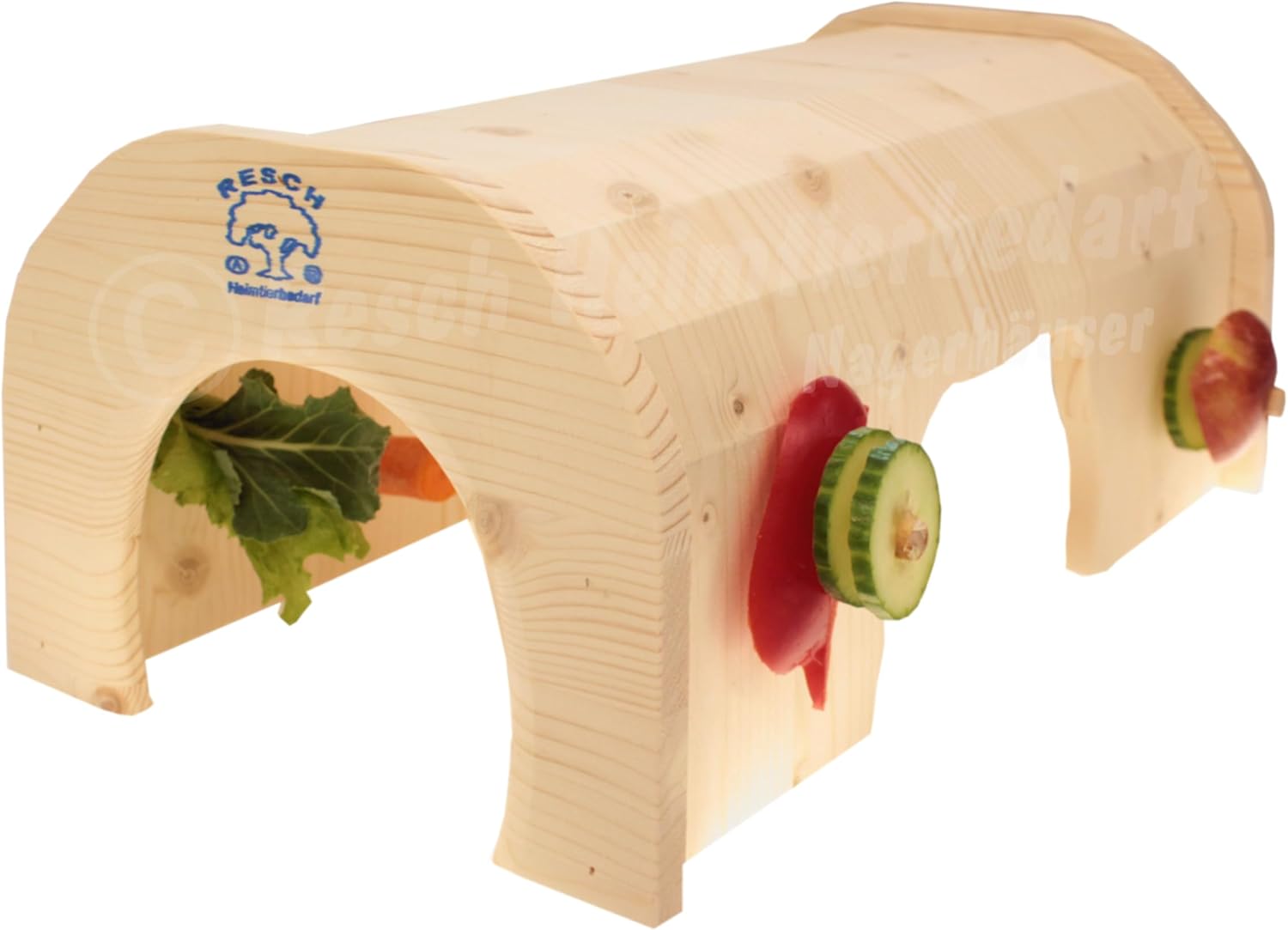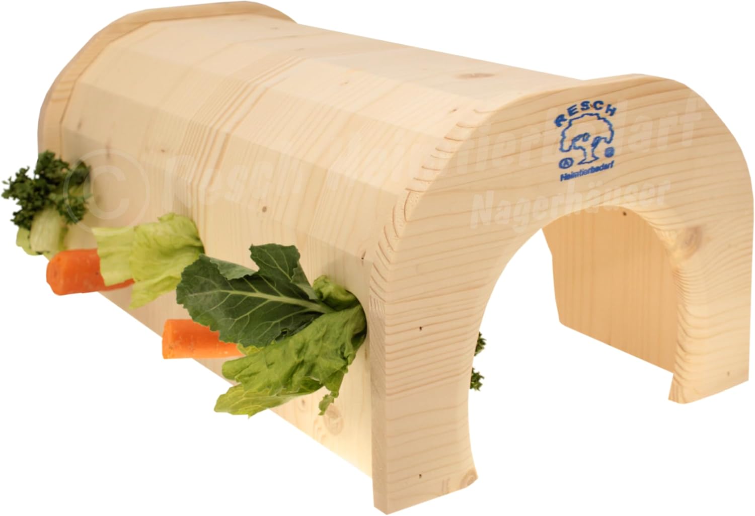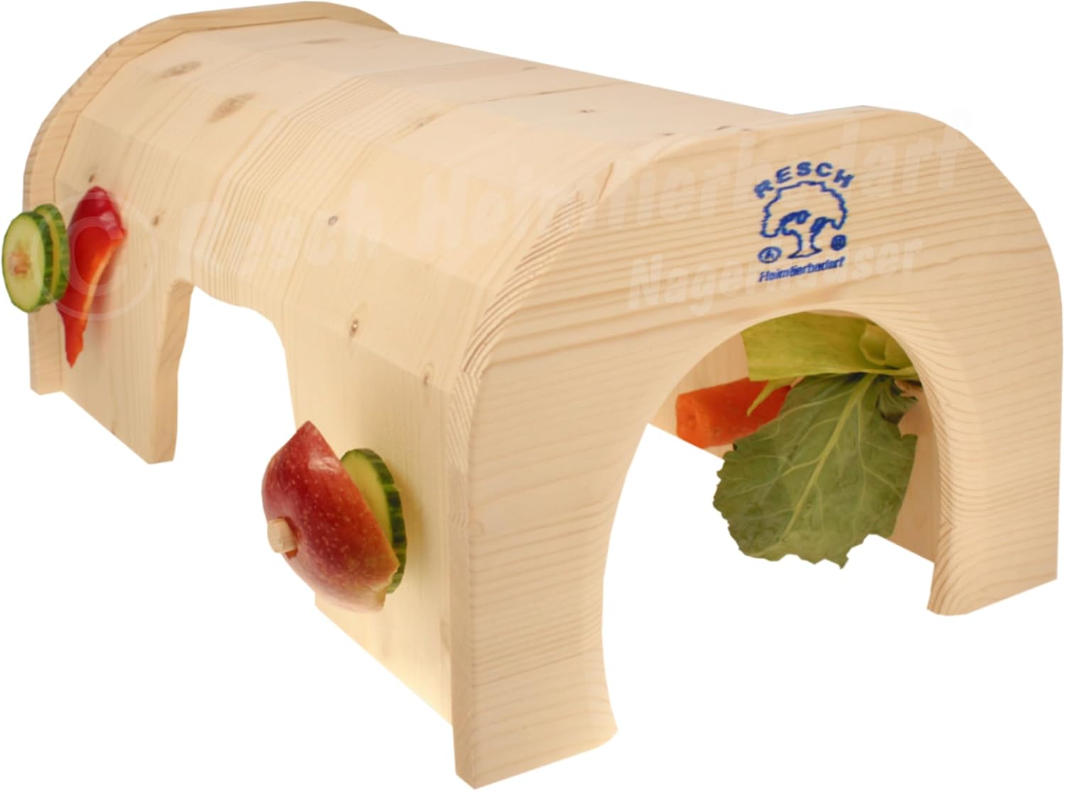 Der Resch Nr46 Futtertunnel naturbelassenes Massivholz aus Fichte bietet Meerschweinchen und Zwergkaninchen eine ideale Kombination aus Rückzugsort und aktiver Beschäftigungsmöglichkeit. Dieses durchdachte Gehege-Element fördert das natürliche Fressverhalten und bietet durch sein variables Design vielfältige Einsatzmöglichkeiten in der Kleintierhaltung. Ein absolutes Must-have für Tierhalter, die Wert auf artgerechte Beschäftigung und robuste, naturbelassene Materialien legen.