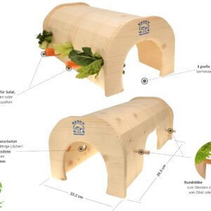 Das Produkt besteht aus naturbelassenem Massivholz und ist somit frei von gesundheitsschädlichen Lacken oder Leimen. Durch das natürliche Material können Ihre Tiere den Tunnel bedenkenlos anknabbern, was ideal für den wichtigen Zahnabrieb ist.
