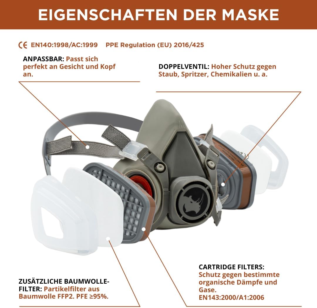 Die RHINO Smart Solutions Atemschutzmaske ist die optimale Wahl für Heimwerker und Profis, die beim Schleifen, Lackieren oder Arbeiten mit Chemikalien Wert auf einen wirkungsvollen Atemschutz legen. Sie schützt zuverlässig vor organischen Gasen, Dämpfen und Feinstaub und ist damit ein unverzichtbarer Begleiter in jeder Werkstatt oder auf der Baustelle.