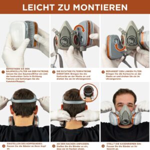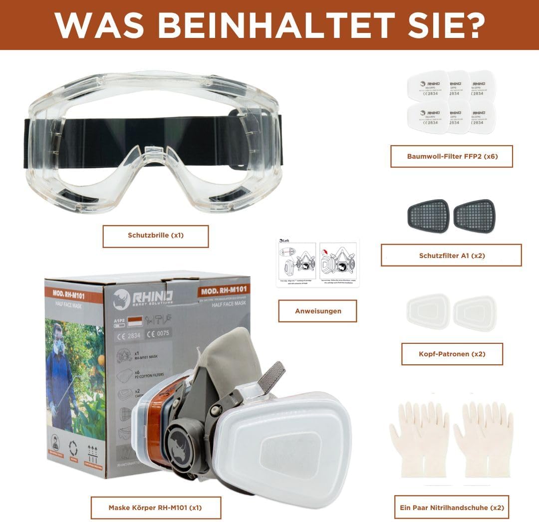 | Lieferumfang | Maske, Filterpatronen, Schutzbrille, Handschuhe |