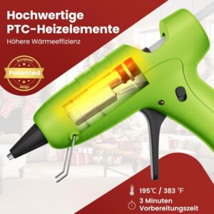 Die RUNSAI Heißklebepistole mit fortschrittlicher PTC-Technik ist bereits nach nur 3 Minuten vollständig einsatzbereit. Das bedeutet keine lange Wartezeit und Sie können sofort mit Ihren Bastel- oder Reparaturprojekten starten. Dies ist deutlich schneller als viele herkömmliche Modelle auf dem Markt.