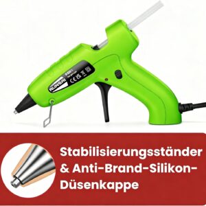 Unser Team hat getestet, wie sich die Pistole im Dauereinsatz verhält: Der optimierte Standfuß ist breiter konstruiert als bei vielen Mini-Klebepistolen und sorgt für stabilen Halt auch auf schmalen Arbeitsflächen. Gerade bei aktivem Arbeiten, wenn die Pistole zwischendurch häufig abgelegt wird, macht sich diese Stabilität bezahlt. Das 1,5m lange Stromkabel bietet ausreichend Bewegungsfreiheit für die meisten Arbeitsbereiche – bei sehr großen Projekten kann ein Verlängerungskabel dennoch sinnvoll sein. Die integrierte Sicherheitsfuse schützt vor Überhitzung und Kurzschlüssen, was besonders bei längeren Bastelstunden Sicherheit gibt.