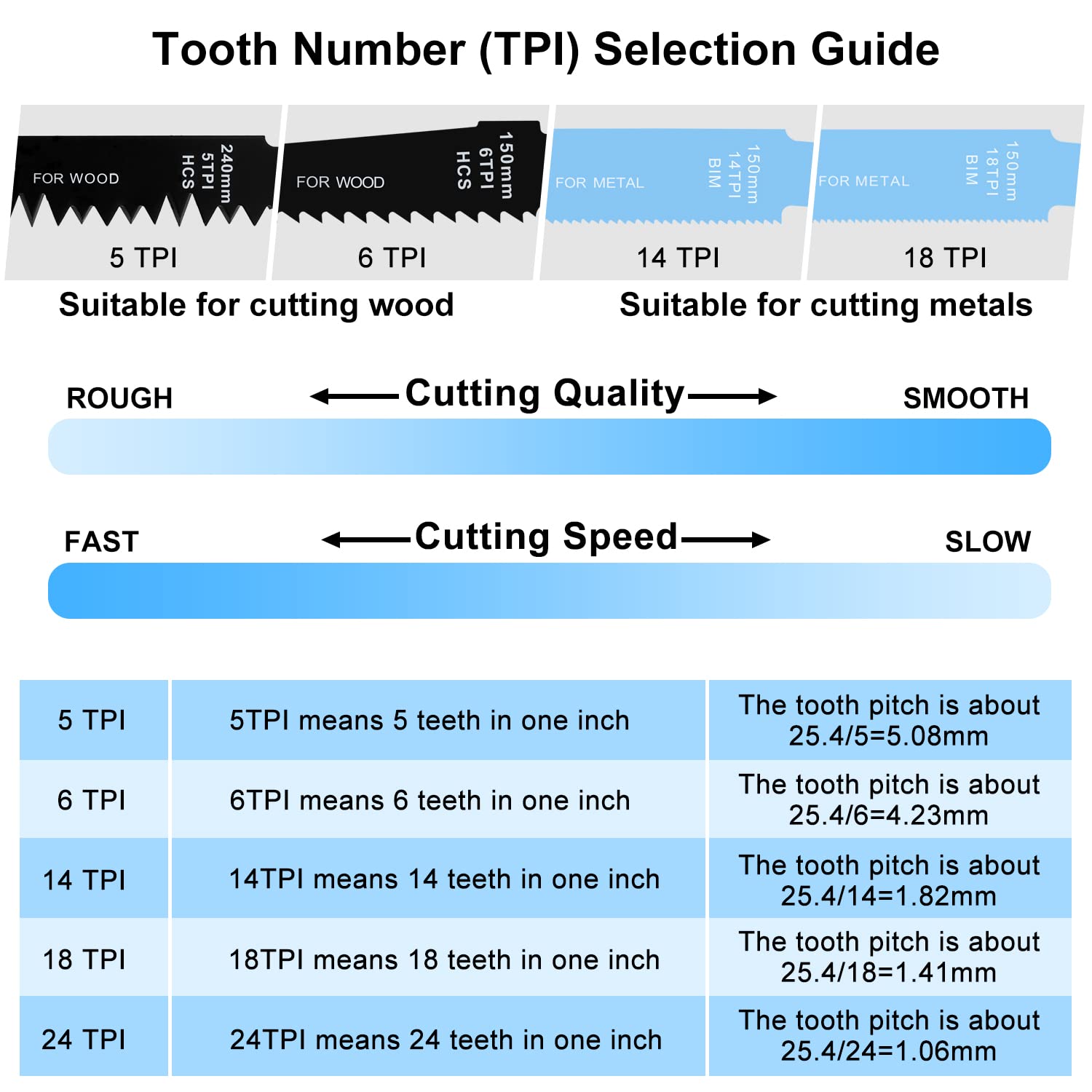 - Breites Einsatzspektrum: Durch die Abstufung von 3 bis 24 Zähnen pro Zoll (TPI) gelingen dir sowohl schnelle, grobe Schnitte als auch präzise, feine Trennungen mühelos.