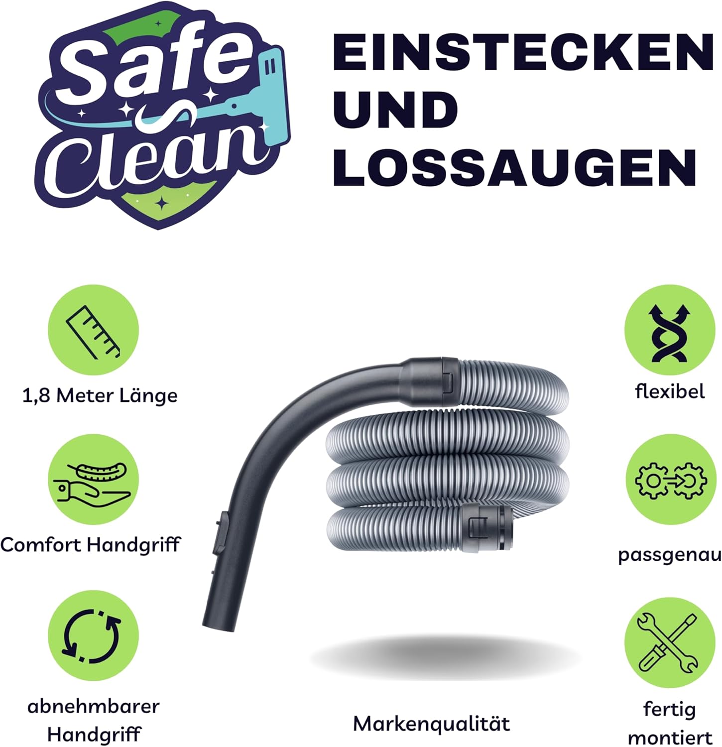 Mit dem SAFE ‚N CLEAN Staubsaugerschlauch kompatibel mit Miele C1 erhältst du eine hochwertige und langlebige Alternative zum Original. Der Ersatzschlauch ist präzise gefertigt und garantiert maximale Passgenauigkeit sowie volle Saugleistung – ganz ohne Leistungsverlust. Dank des „Plug & Clean“-Systems ist der Schlauch sofort einsatzbereit: Er wird komplett vormontiert geliefert, inklusive ergonomischem Handgriff mit Saugkraftregulierung, flexiblem Schlauch und stabilem Geräteanschluss. Einfach