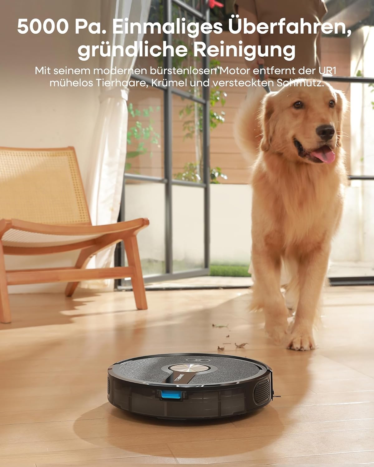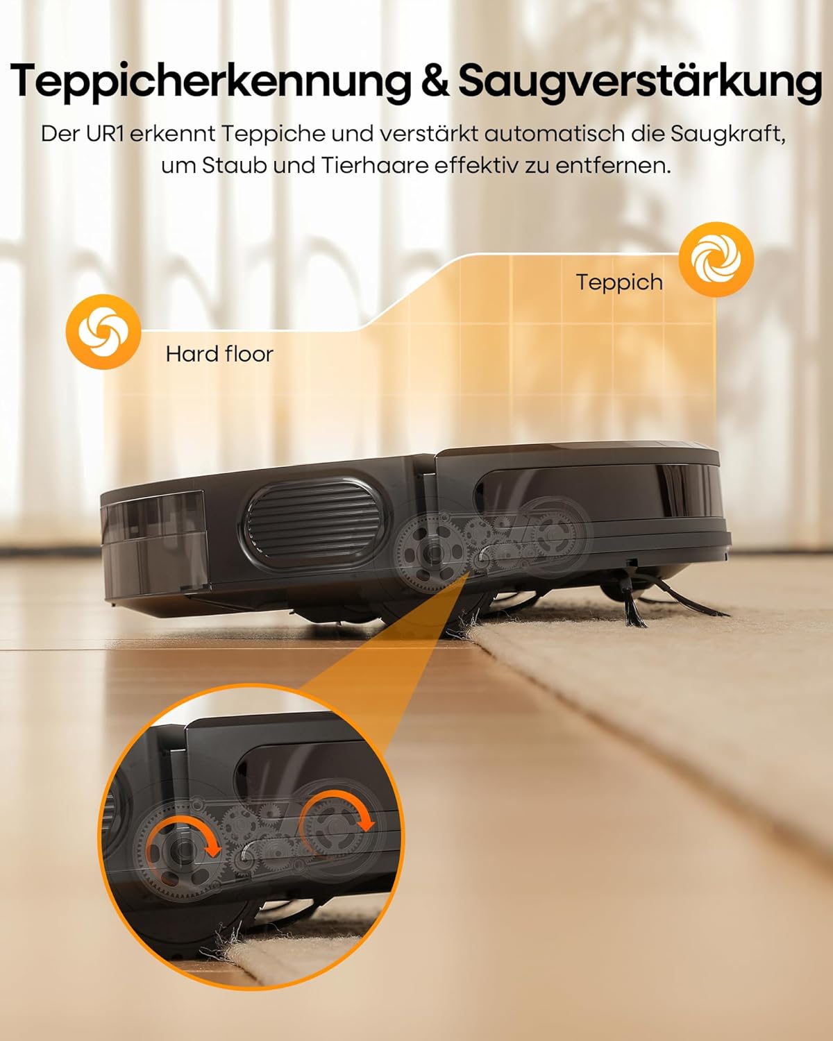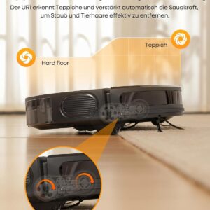 Der UR1 Saugroboter ist dank seines speziellen Antiknäuel-Designs besonders effektiv gegen Tierhaare. Die V-förmige Walze verhindert das lästige Verheddern, während die intelligente Teppicherkennung die Saugkraft automatisch erhöht, um selbst tiefsitzende Haare aus den Fasern zu entfernen.