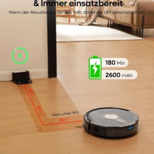 - Unterfahrbare Bauweise: Mit einer Höhe von nur 7,6 cm erreicht der Saugroboter mit Wischfunktion Stellen unter Werkbänken, Schränken und Regalen, die mit einem normalen Sauger unerreichbar sind.