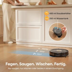 Ein Saugroboter mit Wischfunktion spart Ihnen wertvolle Zeit, da er zwei Reinigungsschritte in einem Arbeitsgang erledigt. Er entfernt nicht nur losen Schmutz und Tierhaare von Ihrem Boden, sondern wischt im selben Durchgang auch feuchte Verschmutzungen auf, was für eine gründlichere Sauberkeit sorgt.